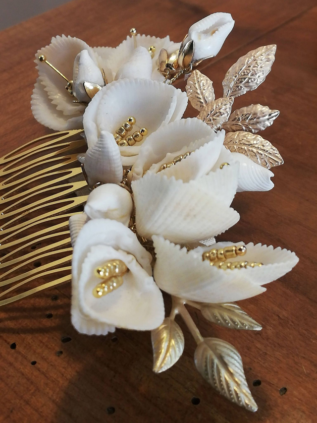 Ce peigne est composé de petits coquillages de l'île de Tahiti.