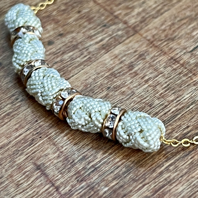 - Matériaux : Chaîne en acier inoxydable, perles tissées main en soie végétale.
