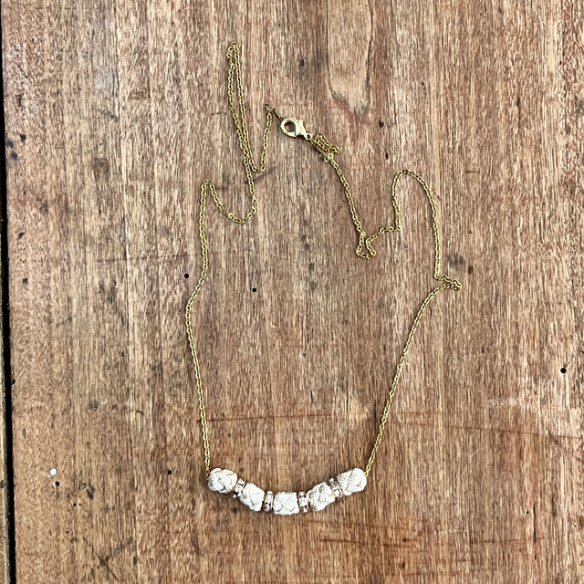 Ce collier délicat aux tons ivoire, sublimé par des perles ornées de strass scintillants, capture l’élégance classique et l’éclat des soirées de fête. Chaque perle semble murmurer une histoire d’étoiles et de douceur, comme une lueur précieuse dans la nuit.