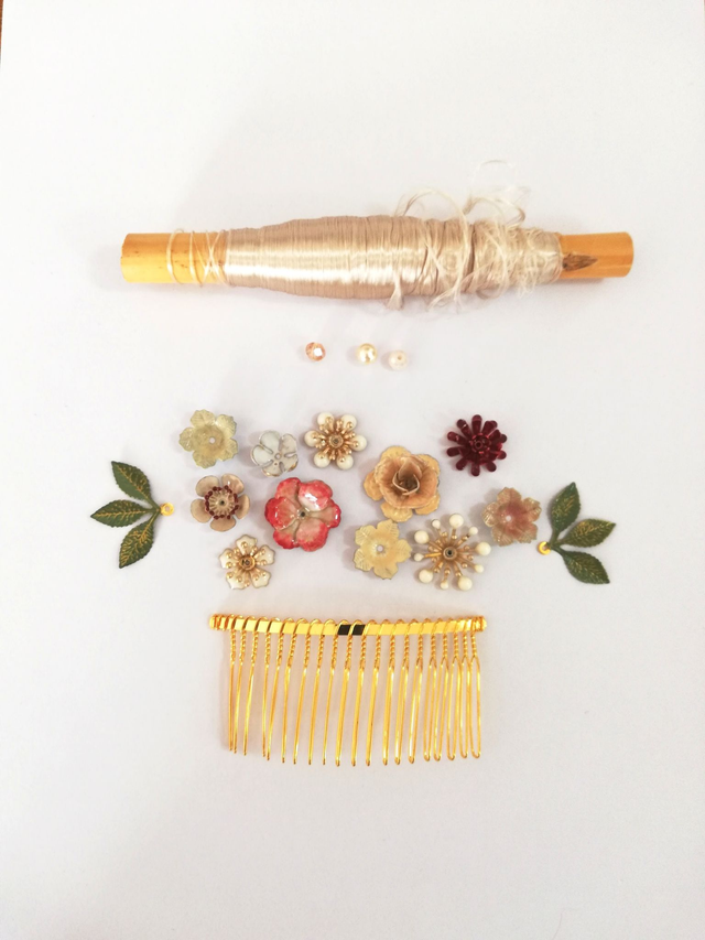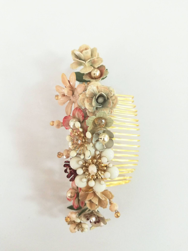 Un joli peigne doré composé de fleurs de métal peintes à la main.